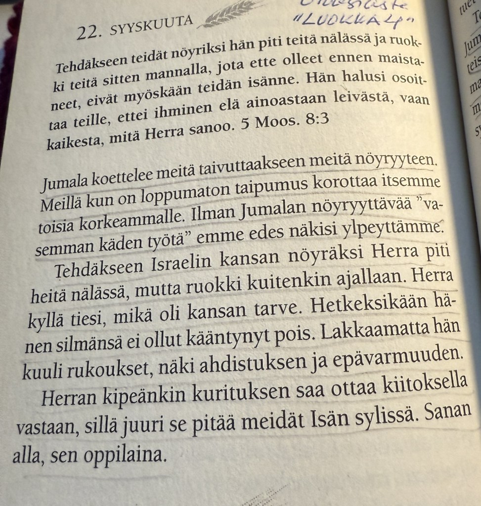 Viimeaikoina saarnateksteissä on puhuttu aiheesta kiitollisuus. Jeesus paransi kymmenen spitaalista, vain yksi palasi kiittämään (Luukas 17:11-19). 22.9.2008 tuli puhelinsoitto jälleen, kuulin ” rinnan biopsiasta löydös luokka 4″. Tänään, 17 vuotta myöhemmin, luettuani päivän tekstin Juha Vähäsarjan hartauskirjasta, Jumalan kämmenellä, kosketti tuntojani syvästi. Voin vain vieläkin ihmetellä, kuinka Jumalan kämmenellä hartauskirjan sanat koskettivat hoitojaksoni aikana päivän tarkasti. Yksi esim. 31.3.2009 ensimmäinen sädehoito; Jesaja 1:25 ”Minä tartun sinuun jälleen, minä puhdistan sinut niin kuin hopea puhdistetaan, kuin lipeällä minä irrotan sinusta kaiken kuonan.” Viimeisen sädehoitopäivän teksti Psalmista 103:2 ”Ylistä Herraa, minun sieluni, älä unohda, mitä hyvää hän on sinulle tehnyt”. Voiko Jumalan sana ajankohtaisemmin ja tarkemmin puhutella? Tänään, 17 vuotta myöhemmin, ajattelen todella kiitollisena Jumalan täydellisestä huolenpidosta. Sanansa kautta Jumala puhui, lohdutti, rohkaisi ja antoi voimia huolehtia myös omasta jaksamisestani. Olen kiitollinen kehittyneelle lääketieteelle, taitaville lääkäreille ja kiitollinen Kolmiyhteiselle Jumalalle Raamatun sanan lupauksista, hoidosta ja huolenpidosta.