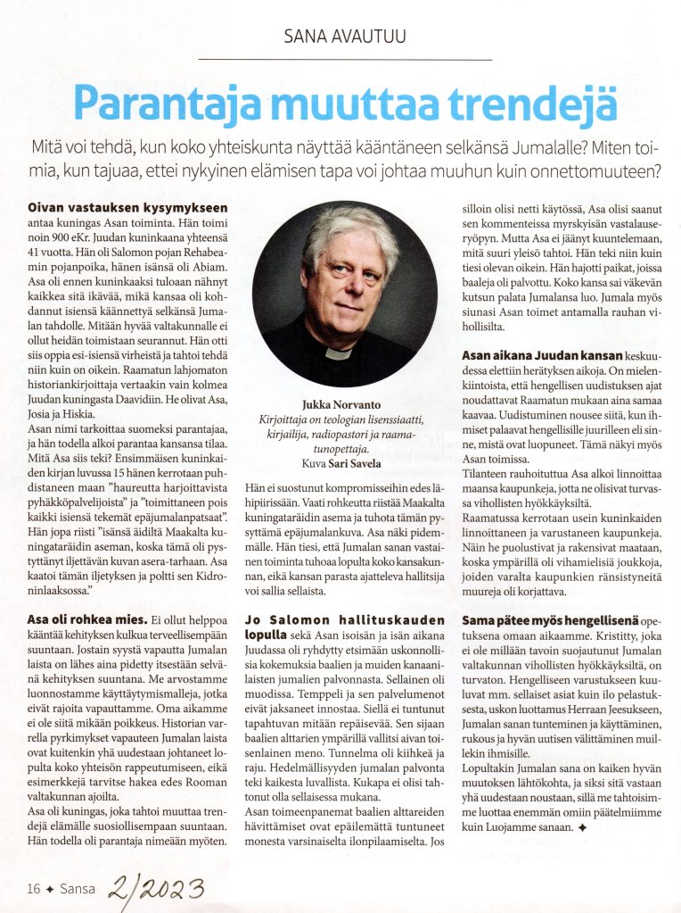 Artikkeli on mielenkiintoinen ja ajankohtainen hätkähtävyydessään. Ajankohtainen artikkeli luotaa rohkean kuningas Asan elämään ja esimerkilliseen toimintaan noin 900 eKr. 2. Aikakirja 14:1-