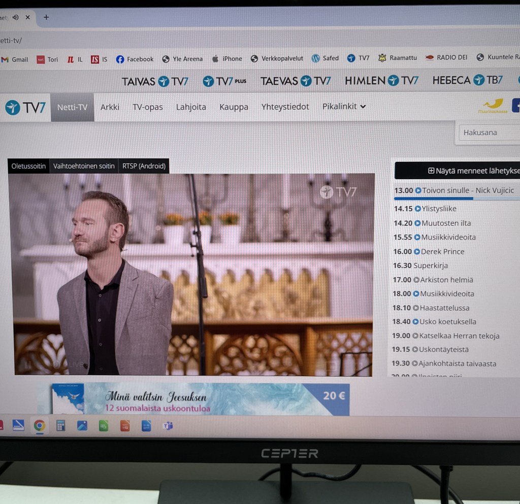 20.4.2024 klo 21.15 TV7 lähetti koskettavan taltioinnin Olevisten kirkosta Tallinnasta. Tilaisuudessa puhui evankelista Nici Vujicic toivon sanomasta kaiken ikäisille. Katsellessani tilaisuutta, mietin, olisipa Suomessakin Nici puhumassa meidän nuorisolle. Kannattaa katsoa TV7 Netti-TV arkistosta tämä lähetys.