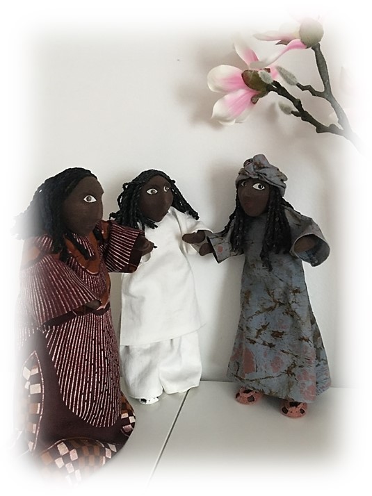 Tarinan opetus puhutteli syvästi. Valmistin 3 afrikkalaista hahmoa, ja yksi heistä on ”kätilövaimo”.