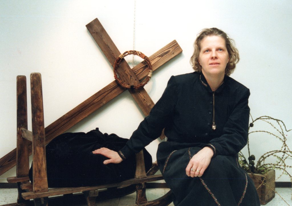 Valmistellessani kevättalvella 1994 ´Raamattu elää koskettaa´ -näyttelyäni minun tuli valmistautua siihen mielestäni aika erikoisella tavalla: helmikuussa matkustin mummolaan, katkoin omenapuun ja lehtikuusen oksia, jotka sitten kotona asettelin veteen ´jalostumaan´. Seuraava projekti oli valmistaa velipuoleni kanssa kuvassa näkyvä iso risti ja etsiä mummuni veljen tekemä vesikelkka, joka löytyi Hämeenlinnan seudulta. Kelkkaan minun tuli valmistaa mustasta sametista oma syntisäkkini. Kuvassa ajattelin istuvani menneisyyteni kivireessä.